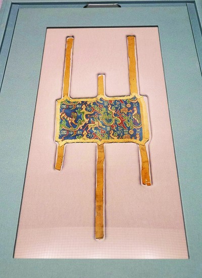 新疆出土的“五星出东方利中国”织锦护臂。 袁欢欢摄/光明图片