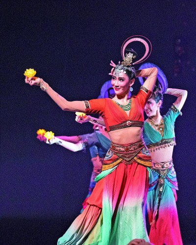 《锦绣》描述的场景是,上元节灯火铺满天空,舞者身着汉式长裙,步伐轻缓蹁跹,在织锦的经纬线上起舞,“五星出东方利中国”织锦护臂逐渐呈现在眼前,汉唐味十足;《远古的呼唤》展现的景象则是,在精绝城首领款待宾客的夜宴上,舞者们身着华美服饰,手持莲花灯翩翩起舞,仿佛龟兹壁画中的仙子下凡,西域风很浓。