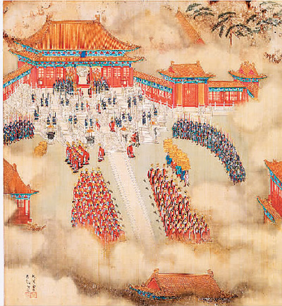 明代《徐显卿宦迹图·皇极侍班》(局部),描绘了紫禁城皇极殿(清代后称为太和殿)的历史风貌。