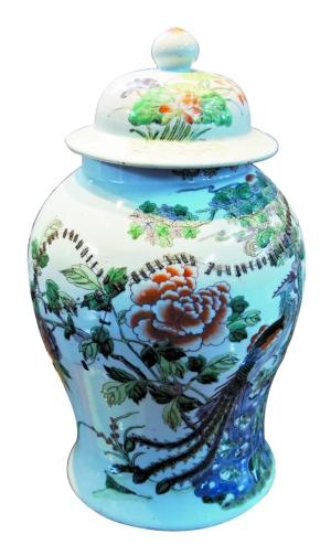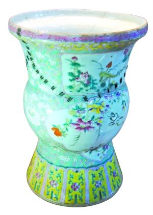 ②锔补过的康熙五彩凤穿牡丹图将军罐。