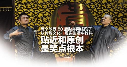 苗阜说,他和王声磨合了六七年,已经形成了固定的表演模式,在陕西当地挺有人气。在他们的表演中,古代典籍、诗词及传统艺术始终是主线,而一个个古今中外结合的包袱,如主线上的颗颗宝石不断为观众制造笑果。在相声《智取威虎山》中,不仅京剧、秦腔的经典剧目被纷纷提及,当演员一嗓子秦腔吼起,唱词却是“赛伯坦星球上,那汽车人……”