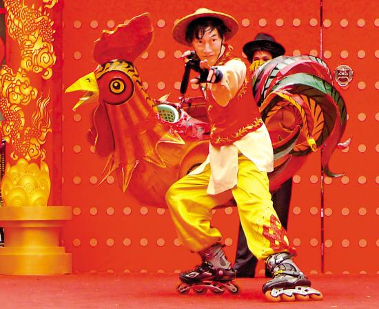 轮滑达人李松辉在往年的广府庙会上表演《轮滑鸡公榄》 羊城晚报记者 郑迅 摄