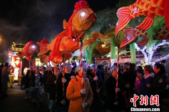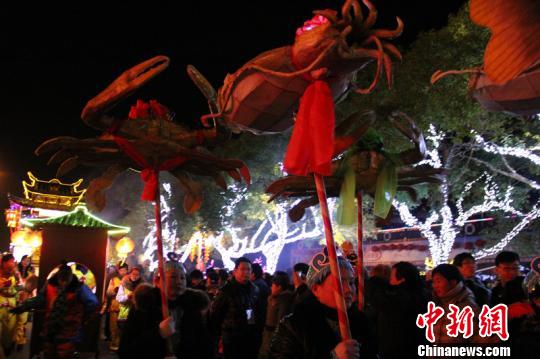 中新网宁波2月13日电(见习记者 林波)“这个是螃蟹,那个是鲳鱼,好像海洋世界啊,”五岁的陈泱烨坐在爸爸的肩头,看着游街的鱼灯队兴奋地说道。2月13日,在习惯把正月十四作为元宵节的浙江石浦渔港古城热闹非凡。这一天,几乎所有的古城居民都是出门参与游街队伍。
