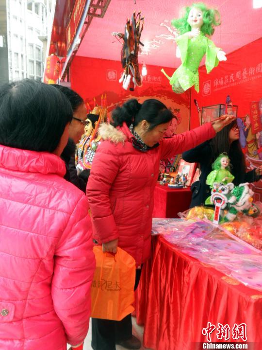 图为一位前来文创集市参观的阿姨耍起了集市摊位摆放的提线木偶,招来了众人的围观。 刘真真 摄