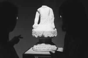 2006年河北南宫紫冢镇后底阁村村民取土时发现石雕佛像70余尊,当年我省文物工作者对遗址抢救性发掘,出土大量北朝至唐代精美石佛造像,尤以汉白玉造像量多质高,石质洁白细腻,造像仪态端庄,衣纹生动自然,而且有绘彩和刻铭。有专家评价后底阁遗址的发掘成果,是河北省继上世纪50年代曲阳修德寺之后佛教考古的又一重大发现。2013年改扩建后的河北博物院试运行,南区一层《曲阳石雕》展厅就展出一尊后底阁村出土的唐代白石佛坐像,佛首在出土时已不知所踪。当时还在河北师大教油画的郭鹏到省博参观,喜爱石刻的他对《曲阳石雕》展品格外青睐,这尊残缺的唐代白石佛坐像令他印象深刻,同时也让他深深惋惜:“佛首哪里去了?”那时谁也没有想到,一年后郭鹏在日本发现了这尊唐代白石佛坐像的佛首。